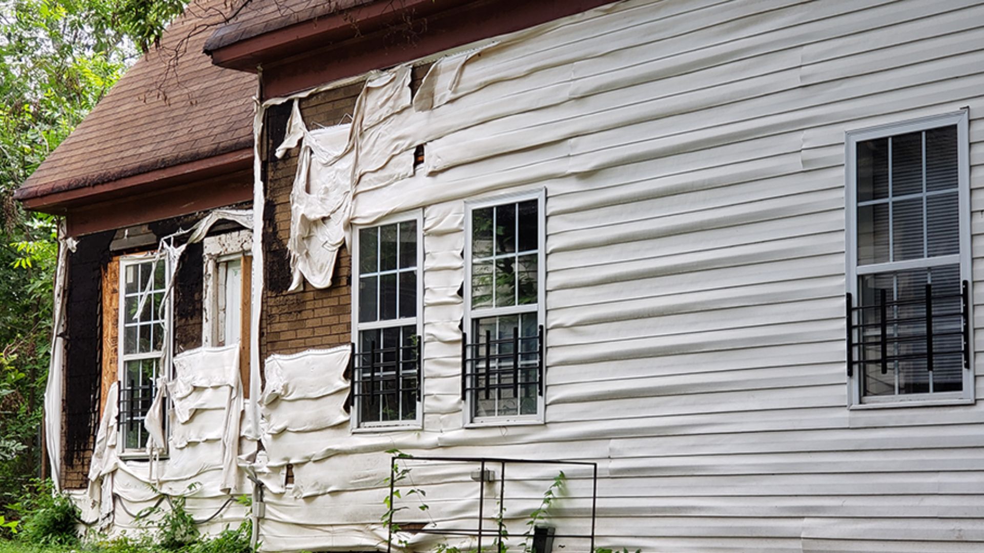 Vinyl siding is melted and warped by intense heat from a neighboring fire at this downtown Atlanta home; Photo credit: kwkirton/ Adobe Stock